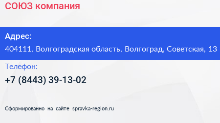 СОЮЗ, компания по адресу 404111, Волгоградская область, Волгоград, Советская, 13 в дальнейшем Организация, размещена в следующих категориях: