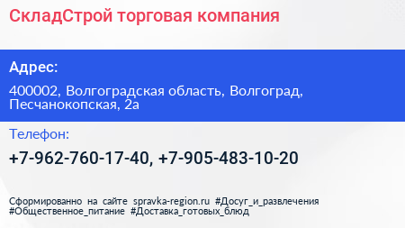 СкладСтрой, торговая компания по адресу 400002, Волгоградская область, Волгоград, Песчанокопская, 2а в дальнейшем Организация, размещена в следующих категориях: