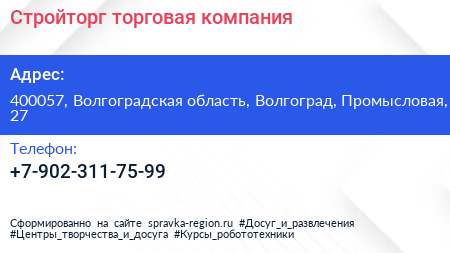 Стройторг, торговая компания по адресу 400057, Волгоградская область, Волгоград, Промысловая, 27 в дальнейшем Организация, размещена в следующих категориях: