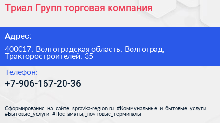 Триал Групп, торговая компания по адресу 400017, Волгоградская область, Волгоград, Тракторостроителей, 35 в дальнейшем Организация, размещена в следующих категориях: