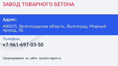ЗАВОД ТОВАРНОГО БЕТОНА по адресу 400075, Волгоградская область, Волгоград, Мирный проезд, 5Б в дальнейшем Организация, размещена в следующих категориях: