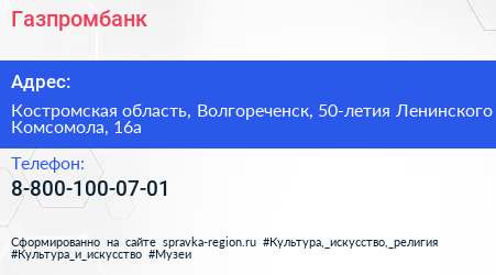 Газпромбанк по адресу Костромская область, Волгореченск, 50-летия Ленинского Комсомола, 16а в дальнейшем Организация, размещена в следующих категориях: