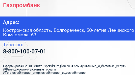 Газпромбанк по адресу Костромская область, Волгореченск, 50-летия Ленинского Комсомола, 63 в дальнейшем Организация, размещена в следующих категориях: