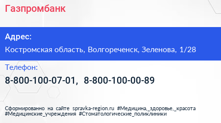 Газпромбанк по адресу Костромская область, Волгореченск, Зеленова, 1/28 в дальнейшем Организация, размещена в следующих категориях: