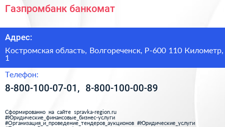 Газпромбанк, банкомат по адресу Костромская область, Волгореченск, Р-600 110 Километр, 1 в дальнейшем Организация, размещена в следующих категориях: