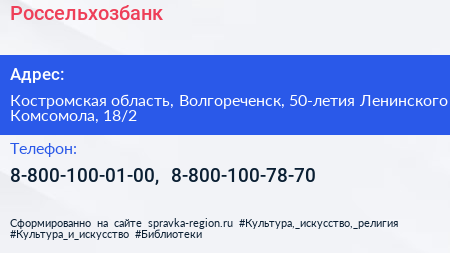 Россельхозбанк по адресу Костромская область, Волгореченск, 50-летия Ленинского Комсомола, 18/2 в дальнейшем Организация, размещена в следующих категориях: