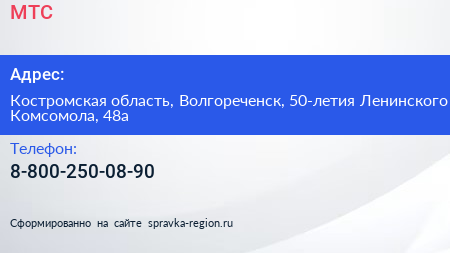 МТС по адресу Костромская область, Волгореченск, 50-летия Ленинского Комсомола, 48а в дальнейшем Организация, размещена в следующих категориях: