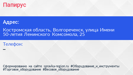 Папирус по адресу Костромская область, Волгореченск, улица Имени 50-летия Ленинского Комсомола, 25 в дальнейшем Организация, размещена в следующих категориях: