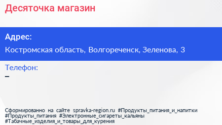 Десяточка, магазин по адресу Костромская область, Волгореченск, Зеленова, 3 в дальнейшем Организация, размещена в следующих категориях: