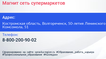 Магнит, сеть супермаркетов по адресу Костромская область, Волгореченск, 50-летия Ленинского Комсомола, 51 в дальнейшем Организация, размещена в следующих категориях: