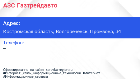 АЗС, Газтрейдавто по адресу Костромская область, Волгореченск, Промзона, 34 в дальнейшем Организация, размещена в следующих категориях: