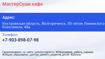 МастерСуши, кафе по адресу Костромская область, Волгореченск, 50-летия Ленинского Комсомола, 48а в дальнейшем Организация, размещена в следующих категориях: