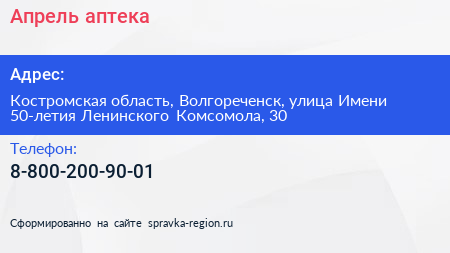 Апрель, аптека по адресу Костромская область, Волгореченск, улица Имени 50-летия Ленинского Комсомола, 30 в дальнейшем Организация, размещена в следующих категориях: