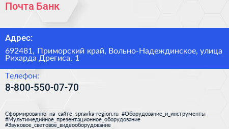 Почта Банк по адресу 692481, Приморский край, Вольно-Надеждинское, улица Рихарда Дрегиса, 1 в дальнейшем Организация, размещена в следующих категориях: