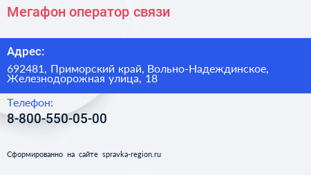 Мегафон, оператор связи по адресу 692481, Приморский край, Вольно-Надеждинское, Железнодорожная улица, 18 в дальнейшем Организация, размещена в следующих категориях: