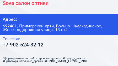Sova, салон оптики по адресу 692481, Приморский край, Вольно-Надеждинское, Железнодорожная улица, 13 ст2 в дальнейшем Организация, размещена в следующих категориях: