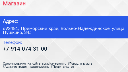 Магазин по адресу 692481, Приморский край, Вольно-Надеждинское, улица Пушкина, 34а в дальнейшем Организация, размещена в следующих категориях: