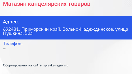 Магазин канцелярских товаров по адресу 692481, Приморский край, Вольно-Надеждинское, улица Пушкина, 32а в дальнейшем Организация, размещена в следующих категориях: