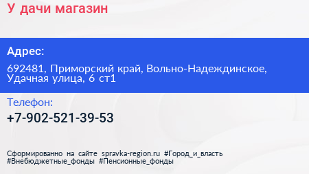 У дачи, магазин по адресу 692481, Приморский край, Вольно-Надеждинское, Удачная улица, 6 ст1 в дальнейшем Организация, размещена в следующих категориях: