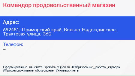 Командор, продовольственный магазин по адресу 692481, Приморский край, Вольно-Надеждинское, Трактовая улица, 36Б в дальнейшем Организация, размещена в следующих категориях: