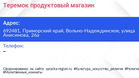 Теремок, продуктовый магазин по адресу 692481, Приморский край, Вольно-Надеждинское, улица Анисимова, 26а в дальнейшем Организация, размещена в следующих категориях: