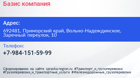 Базис, компания по адресу 692481, Приморский край, Вольно-Надеждинское, Заречный переулок, 10 в дальнейшем Организация, размещена в следующих категориях: