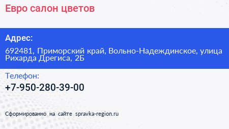 Евро, салон цветов по адресу 692481, Приморский край, Вольно-Надеждинское, улица Рихарда Дрегиса, 2Б в дальнейшем Организация, размещена в следующих категориях:
