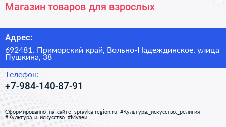Магазин товаров для взрослых по адресу 692481, Приморский край, Вольно-Надеждинское, улица Пушкина, 38 в дальнейшем Организация, размещена в следующих категориях:
