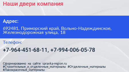 Наши двери, компания по адресу 692481, Приморский край, Вольно-Надеждинское, Железнодорожная улица, 18 в дальнейшем Организация, размещена в следующих категориях: