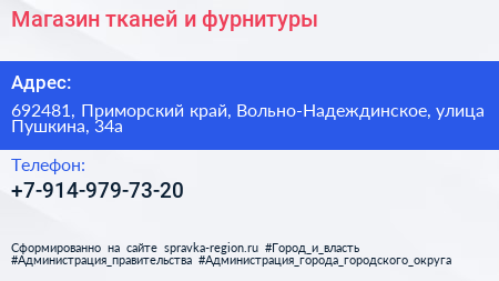Магазин тканей и фурнитуры по адресу 692481, Приморский край, Вольно-Надеждинское, улица Пушкина, 34а в дальнейшем Организация, размещена в следующих категориях: