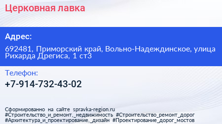 Церковная лавка по адресу 692481, Приморский край, Вольно-Надеждинское, улица Рихарда Дрегиса, 1 ст3 в дальнейшем Организация, размещена в следующих категориях: