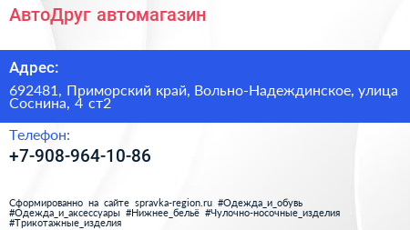 АвтоДруг, автомагазин по адресу 692481, Приморский край, Вольно-Надеждинское, улица Соснина, 4 ст2 в дальнейшем Организация, размещена в следующих категориях: