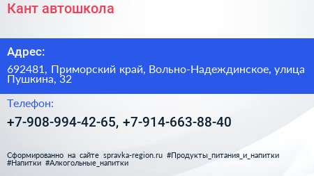 Кант, автошкола по адресу 692481, Приморский край, Вольно-Надеждинское, улица Пушкина, 32 в дальнейшем Организация, размещена в следующих категориях: