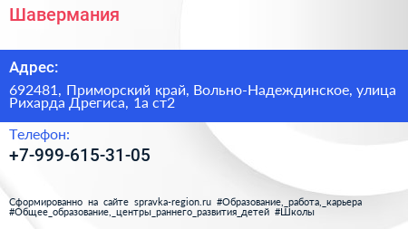 Шавермания по адресу 692481, Приморский край, Вольно-Надеждинское, улица Рихарда Дрегиса, 1а ст2 в дальнейшем Организация, размещена в следующих категориях: