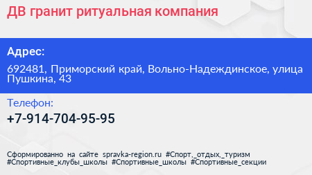 ДВ-гранит, ритуальная компания по адресу 692481, Приморский край, Вольно-Надеждинское, улица Пушкина, 43 в дальнейшем Организация, размещена в следующих категориях: