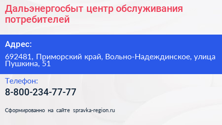 Дальэнергосбыт, центр обслуживания потребителей по адресу 692481, Приморский край, Вольно-Надеждинское, улица Пушкина, 51 в дальнейшем Организация, размещена в следующих категориях: