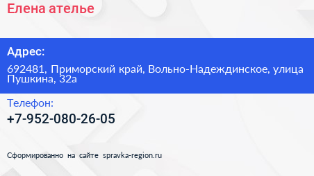Елена, ателье по адресу 692481, Приморский край, Вольно-Надеждинское, улица Пушкина, 32а в дальнейшем Организация, размещена в следующих категориях: