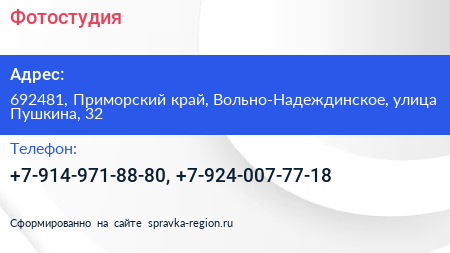 Фотостудия по адресу 692481, Приморский край, Вольно-Надеждинское, улица Пушкина, 32 в дальнейшем Организация, размещена в следующих категориях: