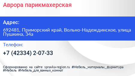 Аврора, парикмахерская по адресу 692481, Приморский край, Вольно-Надеждинское, улица Пушкина, 34а в дальнейшем Организация, размещена в следующих категориях: