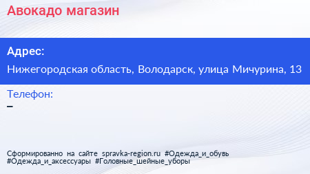 Авокадо, магазин по адресу Нижегородская область, Володарск, улица Мичурина, 13 в дальнейшем Организация, размещена в следующих категориях: