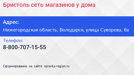 Бристоль, сеть магазинов у дома по адресу Нижегородская область, Володарск, улица Суворова, 8а в дальнейшем Организация, размещена в следующих категориях: