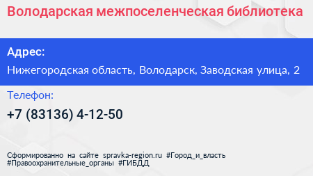 Володарская межпоселенческая библиотека по адресу Нижегородская область, Володарск, Заводская улица, 2 в дальнейшем Организация, размещена в следующих категориях: