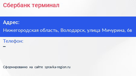 Сбербанк, терминал по адресу Нижегородская область, Володарск, улица Мичурина, 6в в дальнейшем Организация, размещена в следующих категориях: