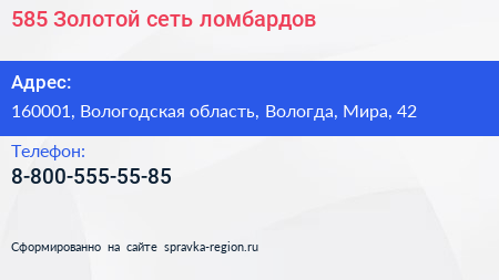 585*Золотой, сеть ломбардов по адресу 160001, Вологодская область, Вологда, Мира, 42 в дальнейшем Организация, размещена в следующих категориях: