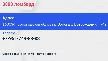 8888, ломбард по адресу 160034, Вологодская область, Вологда, Возрождения, 74в в дальнейшем Организация, размещена в следующих категориях: