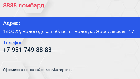 8888, ломбард по адресу 160022, Вологодская область, Вологда, Ярославская, 17 в дальнейшем Организация, размещена в следующих категориях:
