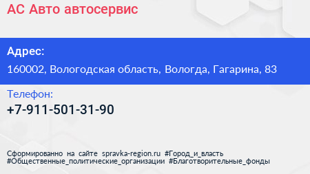 АС-Авто, автосервис по адресу 160002, Вологодская область, Вологда, Гагарина, 83 в дальнейшем Организация, размещена в следующих категориях: