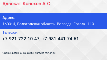 Адвокат Конохов А.С. по адресу 160014, Вологодская область, Вологда, Гоголя, 110 в дальнейшем Организация, размещена в следующих категориях: