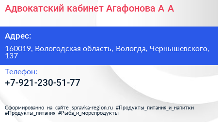 Адвокатский кабинет Агафонова А.А. по адресу 160019, Вологодская область, Вологда, Чернышевского, 137 в дальнейшем Организация, размещена в следующих категориях: