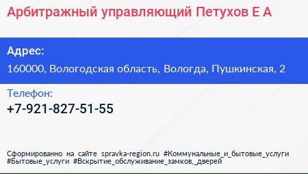 Арбитражный управляющий Петухов Е.А. по адресу 160000, Вологодская область, Вологда, Пушкинская, 2 в дальнейшем Организация, размещена в следующих категориях: